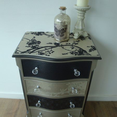Top and drawer fronts decoupaged in a variety of co-ordinating metallic, beaded and flock papers.