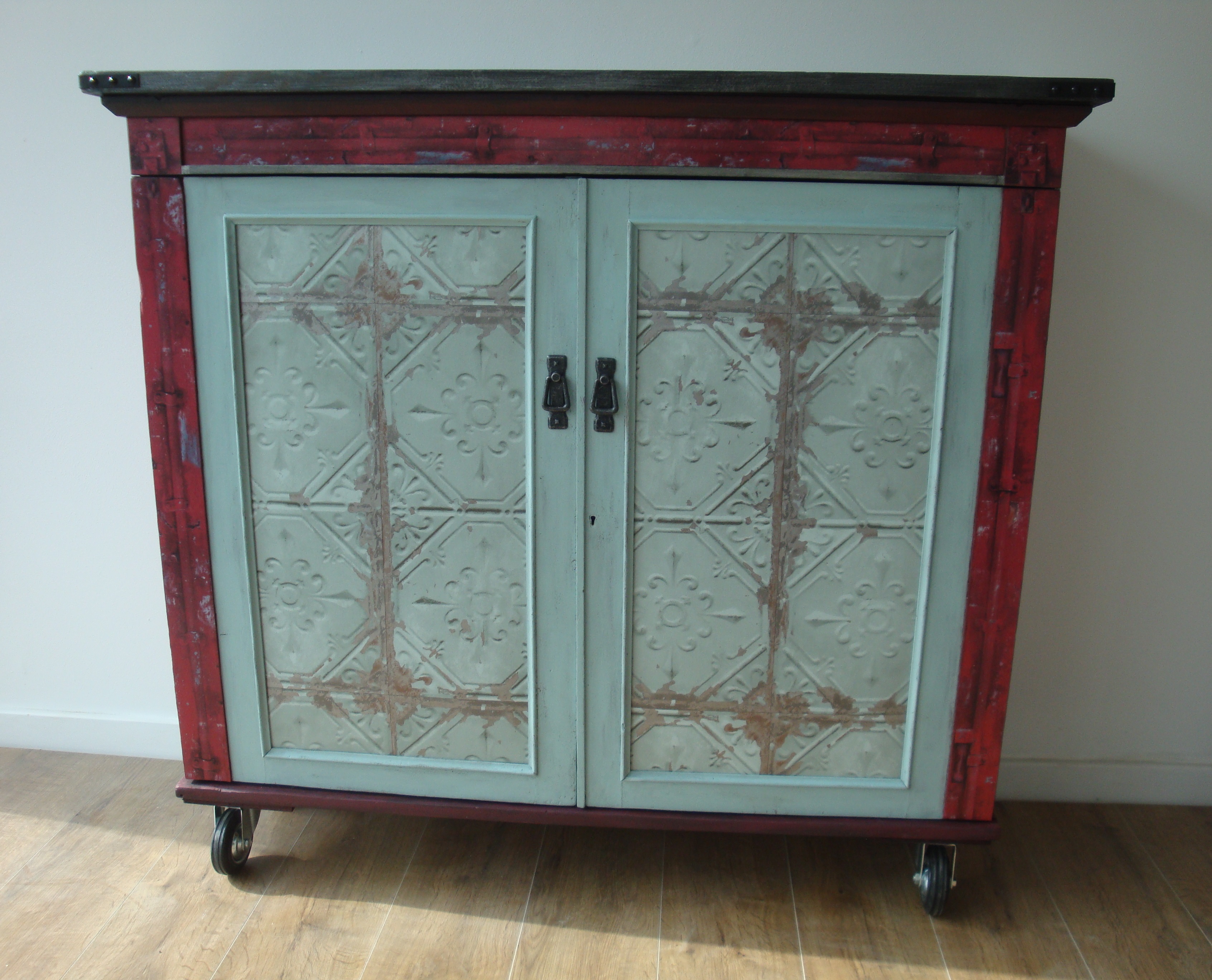 The top has been painted to give a battered and aged zinc look. The whole cupboard has been varnished to protect the finishes.